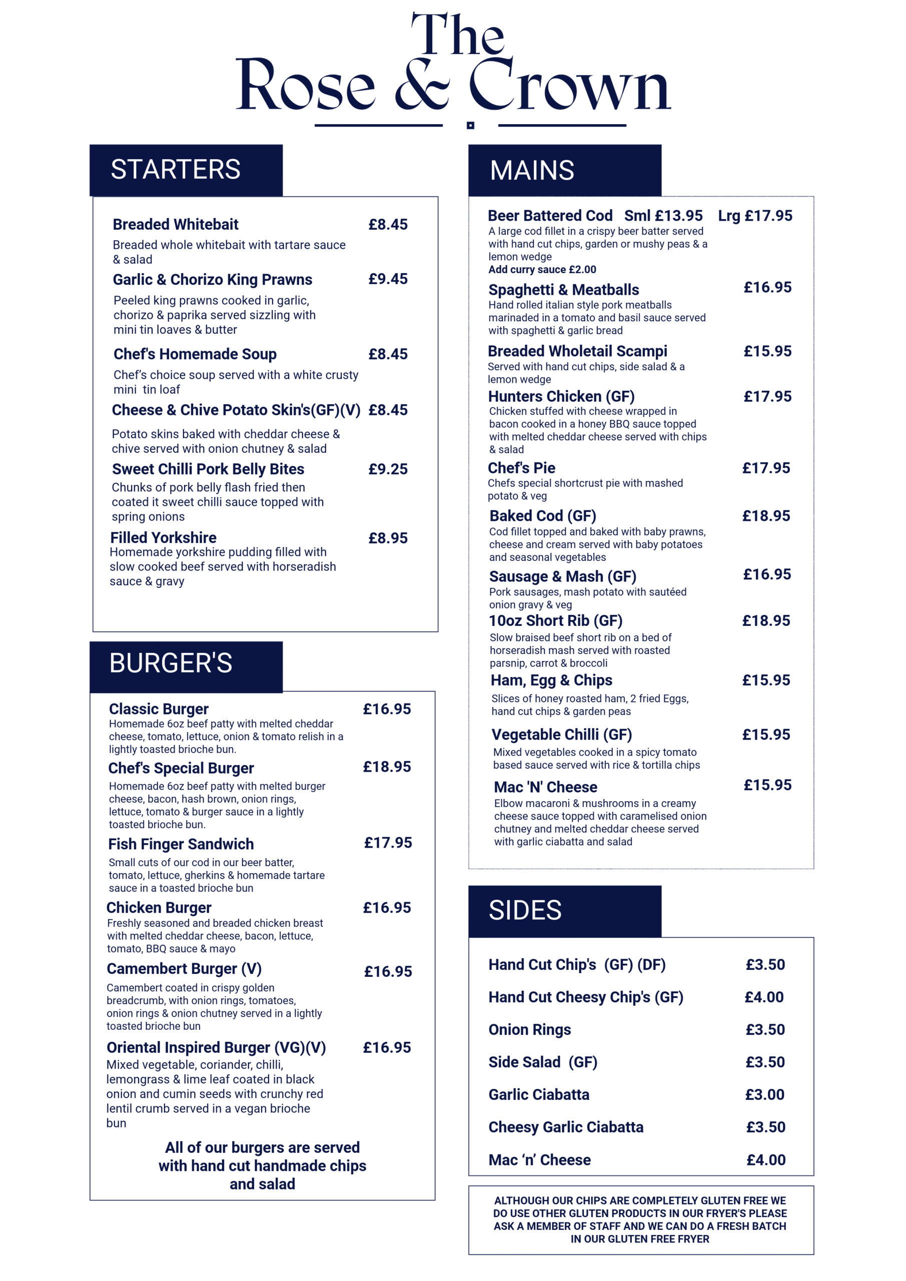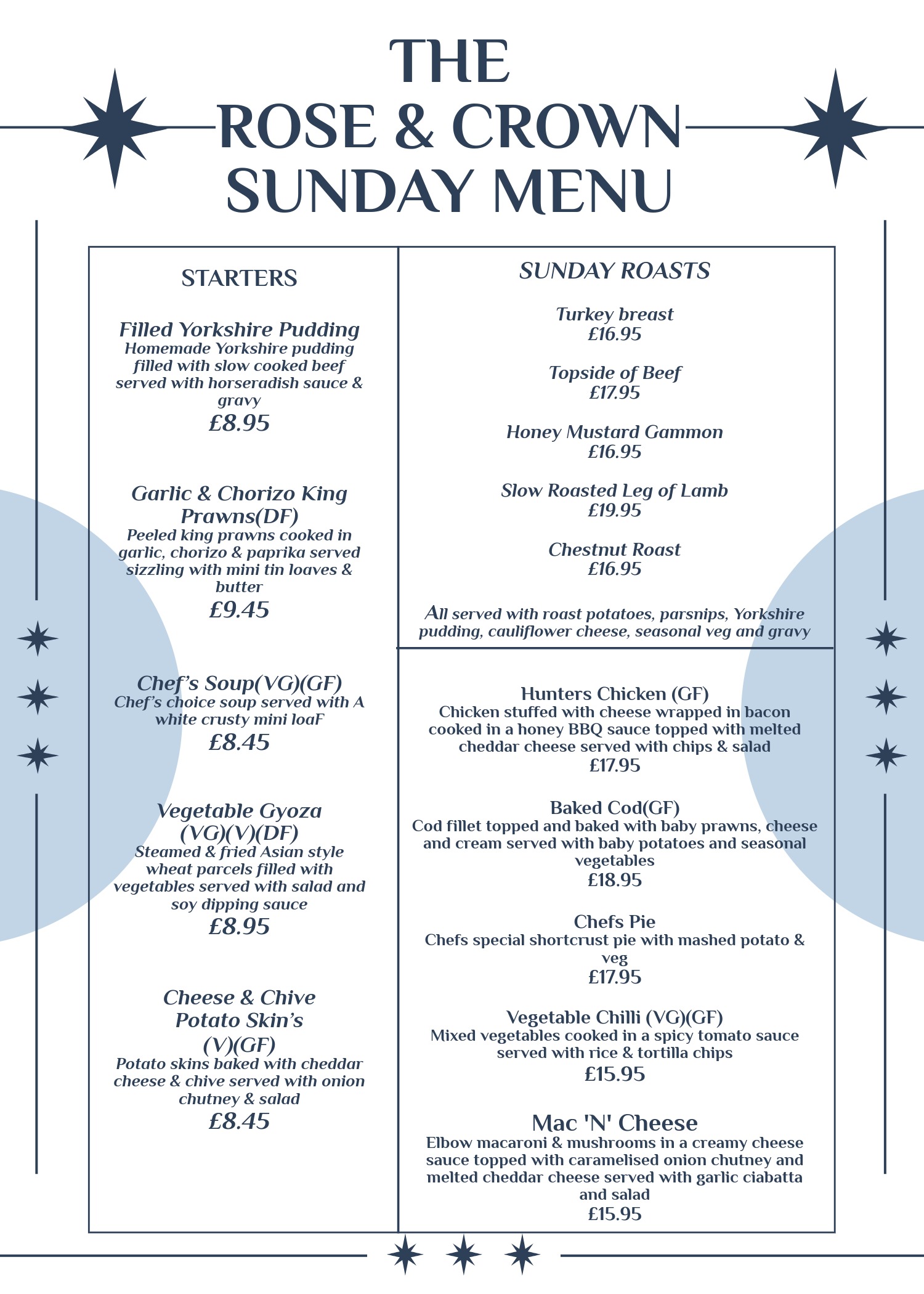 The Rose & Crown MAIN Menu THE ROSE & CROWN SUNDAY LUNCH THE ROSE & CROWN TAKE-AWAY MENU Book Now THE ROSE & CROWN SPECIAL MENU Book Now The Rose & Crown Events & Shows coming soon Learn More